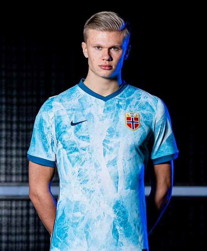 EURO2020に向けて作られたノルウェー代表のアウェイユニフォーム。北欧の気候を感じる冷涼感たっぷりのデザインは、ノルウェーの風土を象徴する氷山を描いたもの。