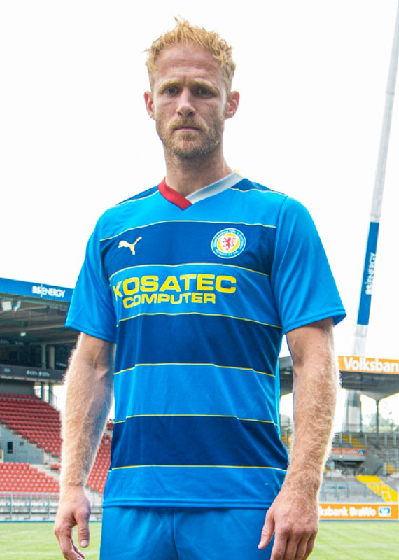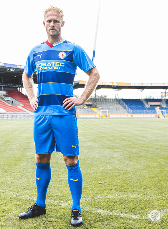 23-24新アウェイユニフォームは濃淡ブルーでボーダーをデザイン。ホームタウンであるブラウンシュヴァイクの紋章色のレッドとシルバーで襟を彩る。ブルーはアウェイユニフォームの定番カラーだ。