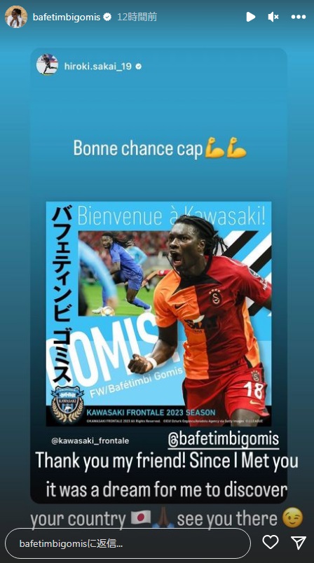 現在は浦和レッズでプレーする酒井が「グッドラック」とメッセージを送ると、ゴミスも返信。
