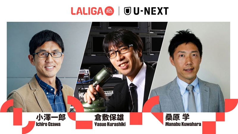実況・解説陣には、ラ・リーガに精通する倉敷保雄⽒、⼩澤⼀郎⽒、桑原学⽒が決定。3名はなんとU-NEXT独占で実況・解説を務めるという。