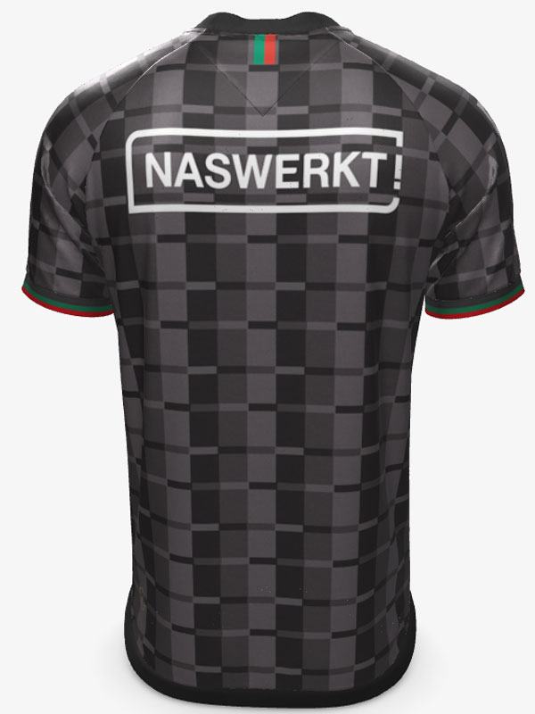 23-24新アウェイユニフォームは、ブラックをはじめとする濃淡ダークカラーでチェック(格子柄)をデザイン。胸のレッドとグリーンのボーダーで、エンブレムにも使われているチームカラーの3色となる。