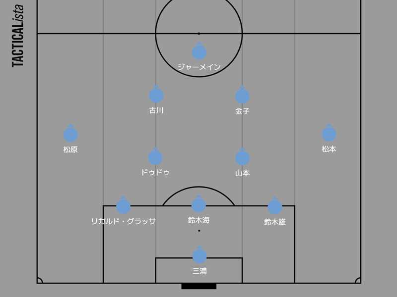 上図は、町田戦のスタメンをそのまま3バックに当てはめたものだ。複数ポジションに対応する鈴木雄斗と松本昌也の存在により、選手交代をすることなく3バックを導入できる。