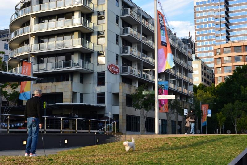 犬の散歩をする微笑ましいおじさんの写真を撮影しても、背景にはしっかりとフラッグが写り込む。