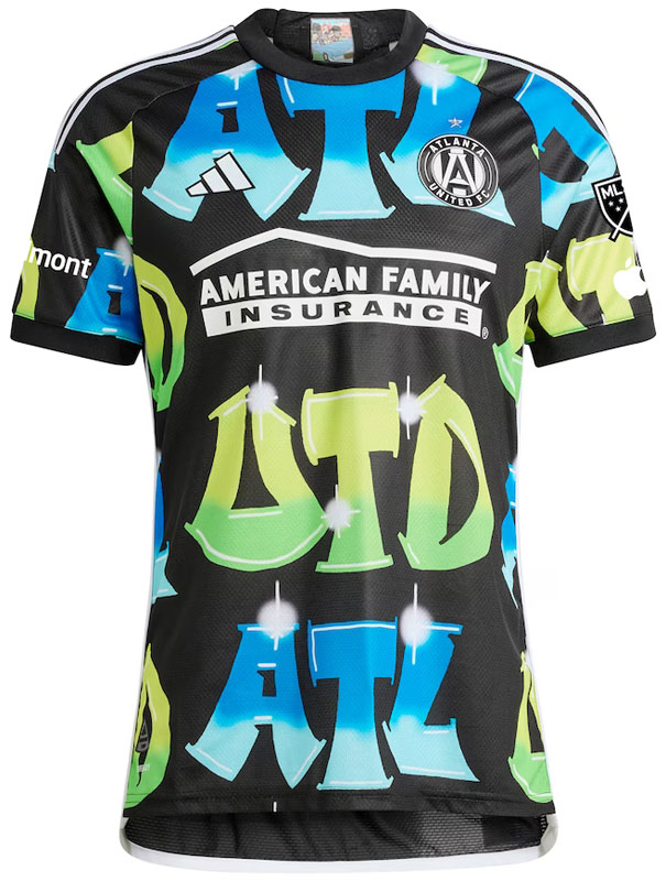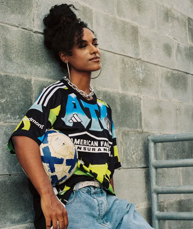 「404キット」と呼ばれる新サードユニフォームは、ブラックを基調にブルーとグリーンのグラフィカルなストリートの落書き風デザインが強烈なインパクトを放つ。文字は“ATL”と“UTD”で、チーム名の略称となる。