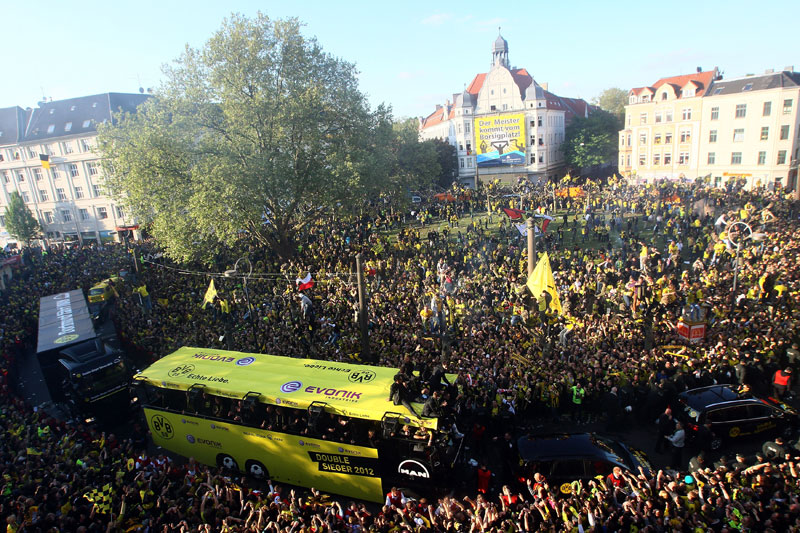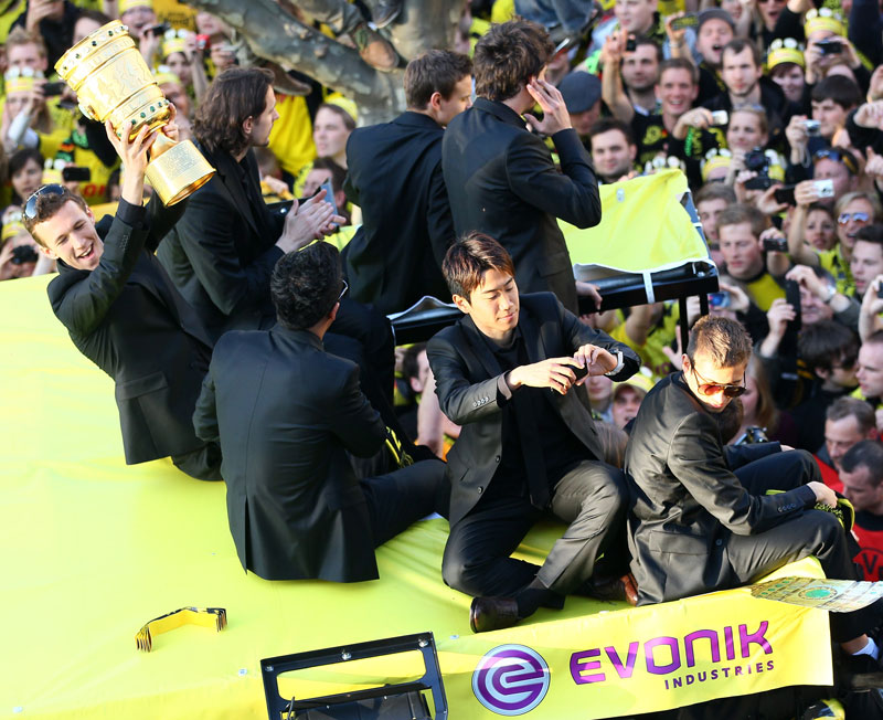 この2枚の写真は2012年にDFBポカールを優勝した際のパレードの様子。文字通り優勝の立役者で英雄となった香川真司も、バスの屋根に乗ってこの通りパレードに参加。懐かしい光景だ。