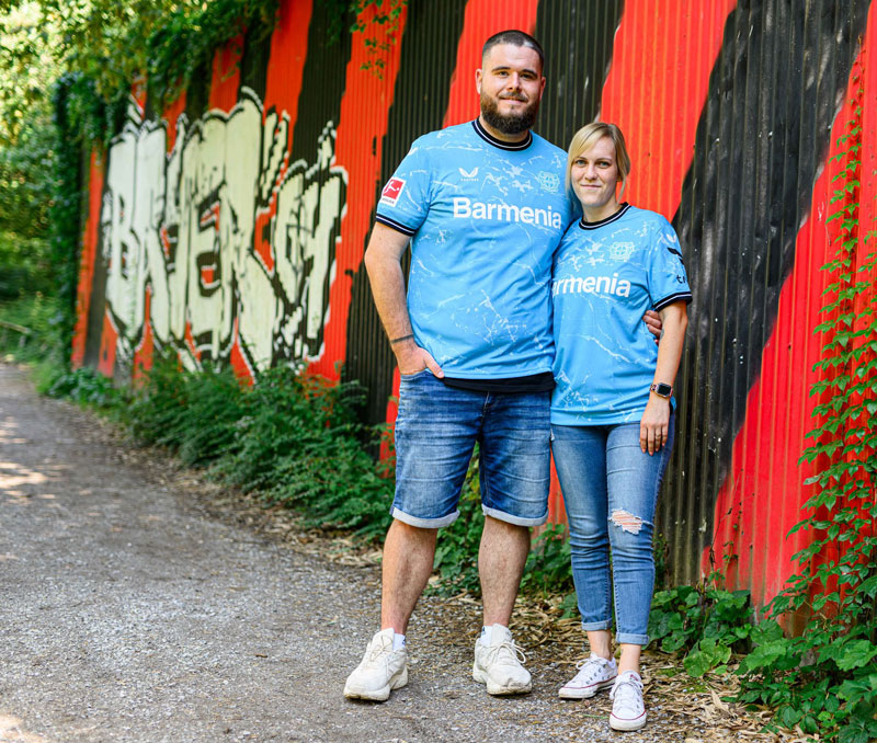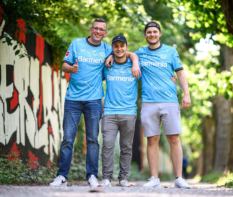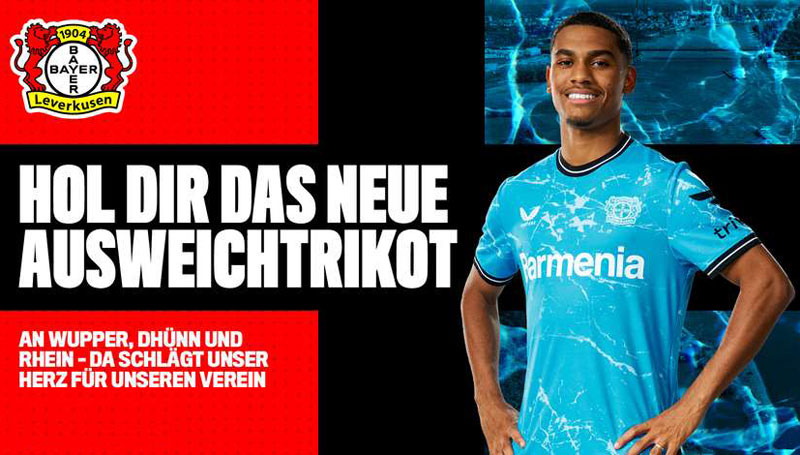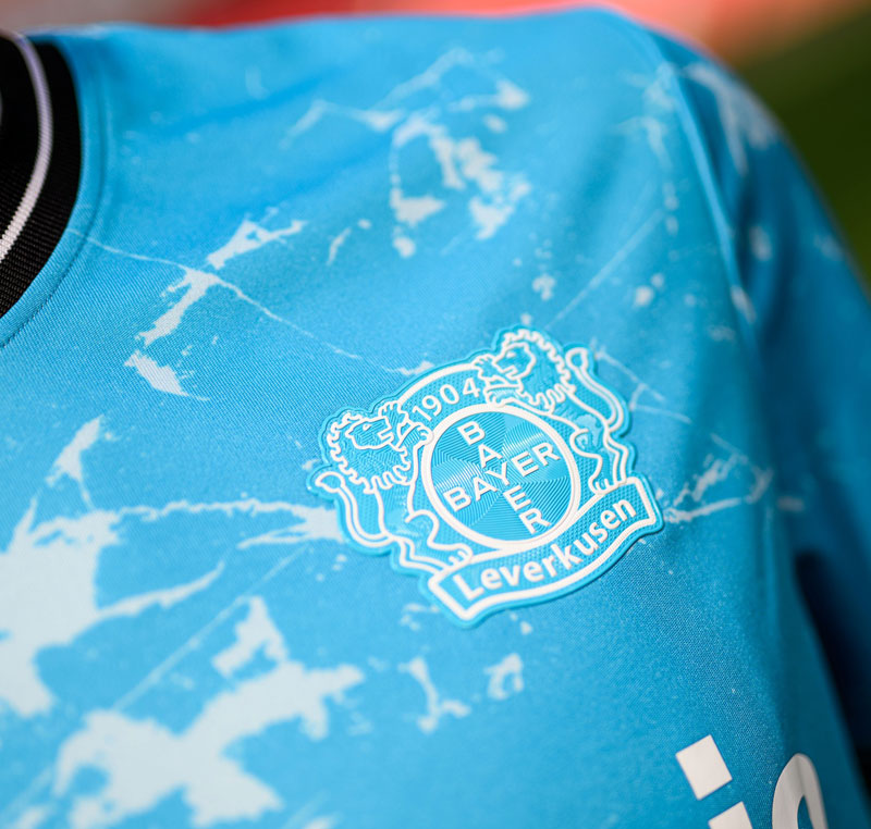 レヴァークーゼンでは珍しいスカイブルーの基調色。この色はクラブ側の説明だと正確にはシアンブルーなのだが、その中に地域を流れる3つの川(ヴッパー川、ライン川、デュン川)をホワイトのラインで描いている。