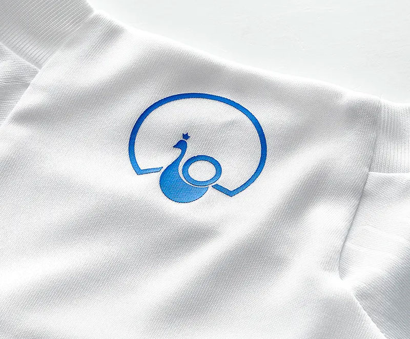背面首元のピーコックは1981年から84年まで使用したエンブレムに描かれていたもので、今回は孔雀の部分だけを抜き出してデザインしている。
