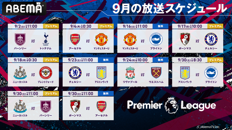 「ABEMA」「プレミアリーグ」9月放送スケジュール