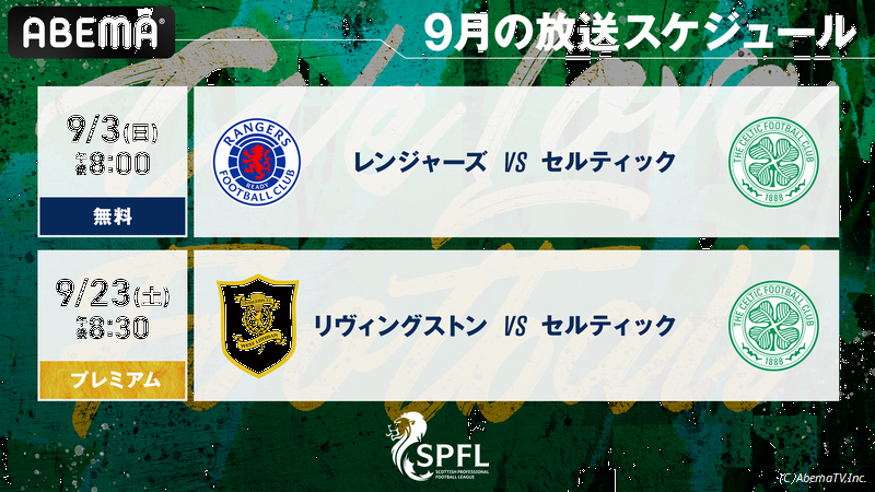 「ABEMA」 「スコティッシュ・プレミアシップ」2023-24シーズン 9月放送スケジュール