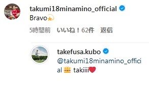 南野が「ブラボー」とコメントすると、久保は「takiiii」と王冠とハートの絵文字付きで返信していた。