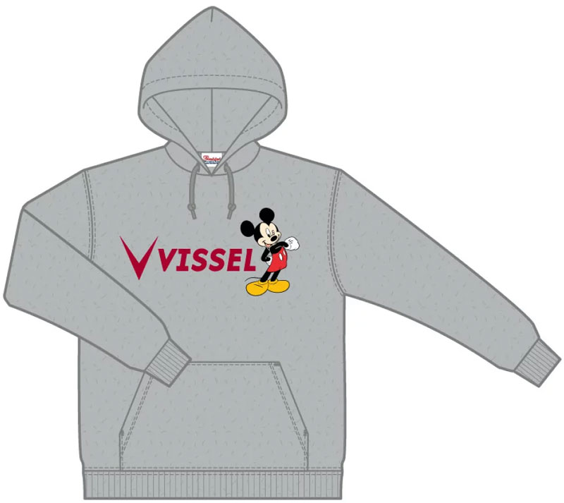 前身頃にチームのロゴとミッキーマウスをデザインするフード付きパーカー。色はグレーとホワイトの2色展開。