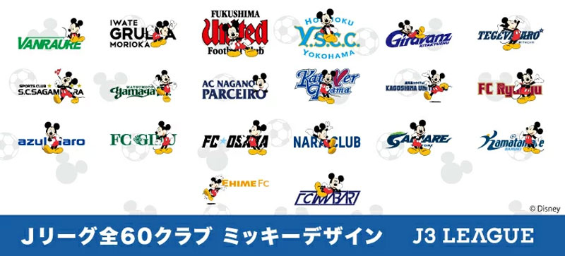 J3リーグ全20チームはこんな感じに!福島ユナイテッドのロゴはJリーグ全60チームで最もミッキーを合わせるのが難しかったのではないだろうか。