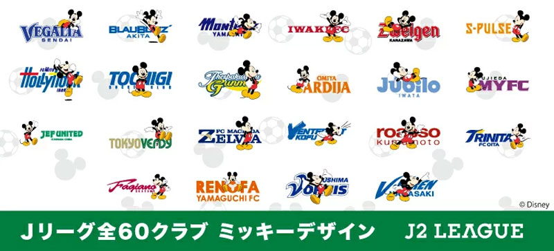 J2リーグ全22チームのミッキーはこんな感じに。V・ファーレン長崎はミッキーがロゴと一体化しているようで印象的!