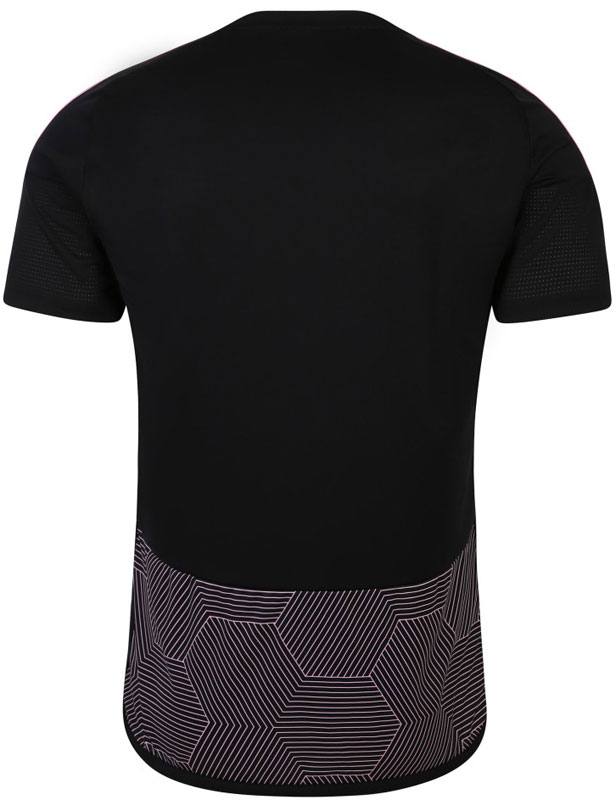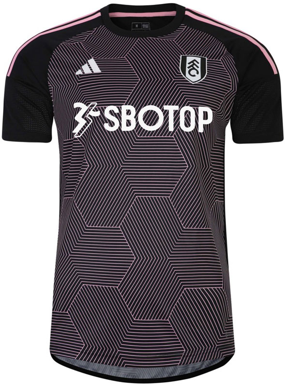 23-24新サードユニフォームは、フラム定番のブラックとホワイトにピンクを組み合せた新鮮なデザイン。ハニカムとも亀甲柄とも形容できそうな幾何学的グラフィックが目を引く。