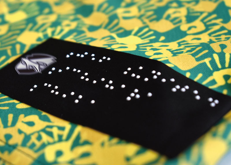 前面裾部分にはクラブ名を点字加工で施し、浮き出た文字を実際に指先で触って読み取れるようにしている。