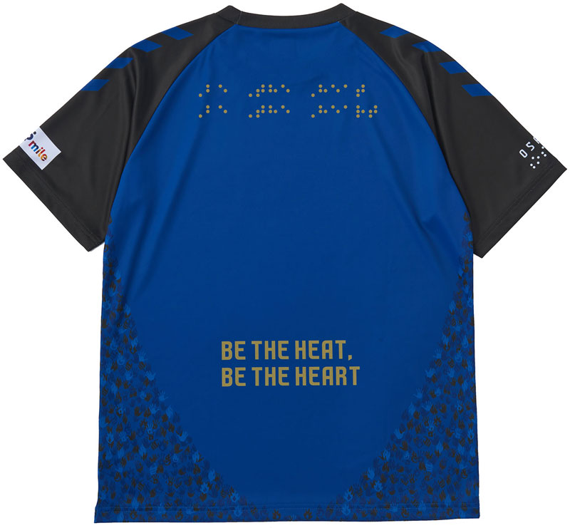 胸部はクラブ名「gamba osaka」。右袖はホームタウン名「osaka」。背中には「BE THE HEAT , BE THE HEART」を点字と文字で配置。