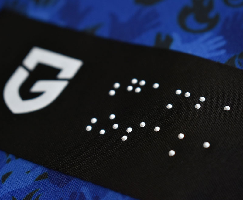 前面裾部分にはクラブ名を点字加工で施し、浮き出た文字を実際に指先で触って読み取れるようにしている。