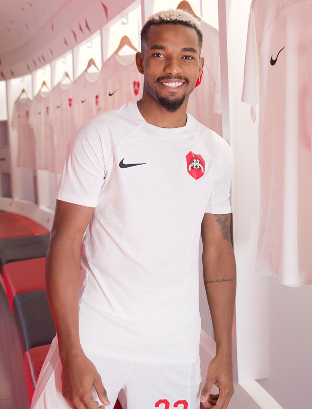 23-24新アウェイユニフォームは伝統的に使われるホワイトを基調としたデザイン。エンブレムはクラブカラーのレッドで彩る。
