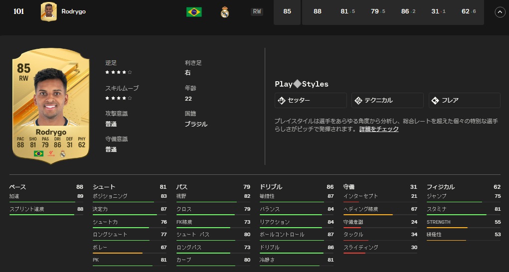 スピード88、シュート81、パス79、ドリブル86、守備31、フィジカル62
