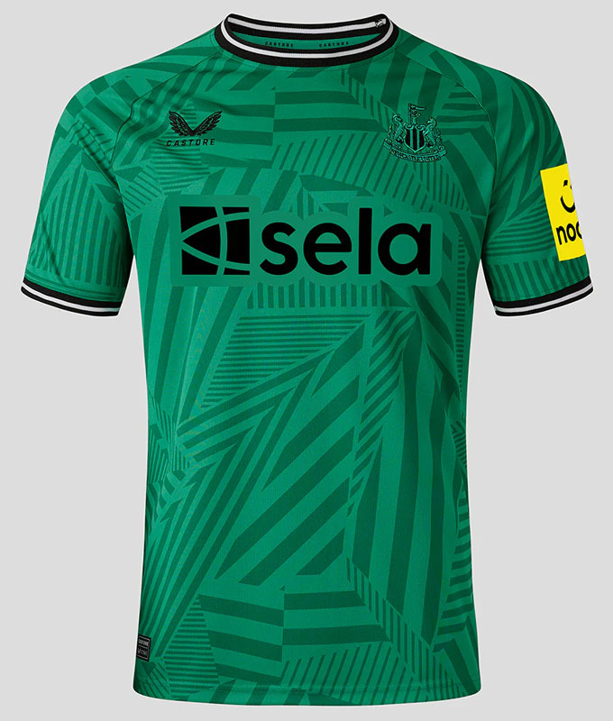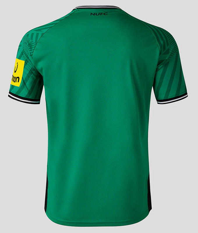 23-24新アウェイユニフォームはグリーンを基調に、前面に幾何学的なダズル迷彩パターンを採用。ニューカッスルでは珍しいタイプのデザインが登場した。