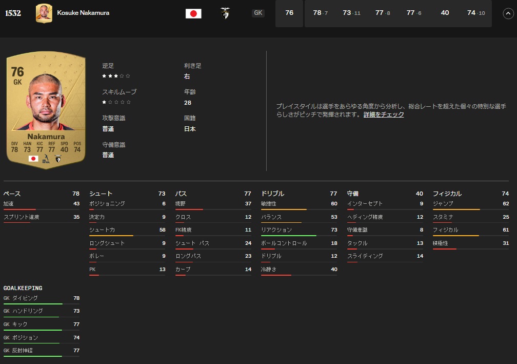 ダイビング78、ハンドリング73、キック77、反射神経77、スピード47、ポジション74