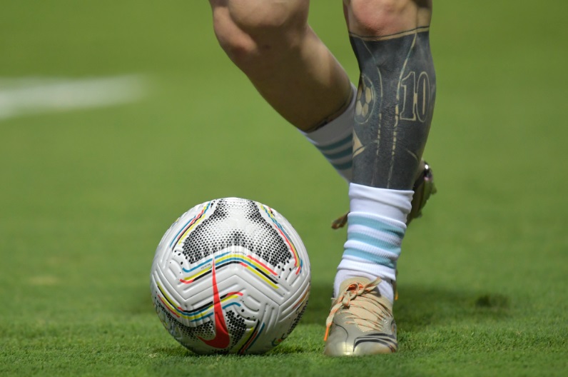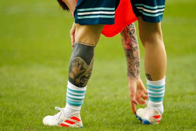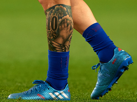 メッシは体に多くのタトゥーを刻んでいるが、左足の膝下は黒く塗りつぶされている。