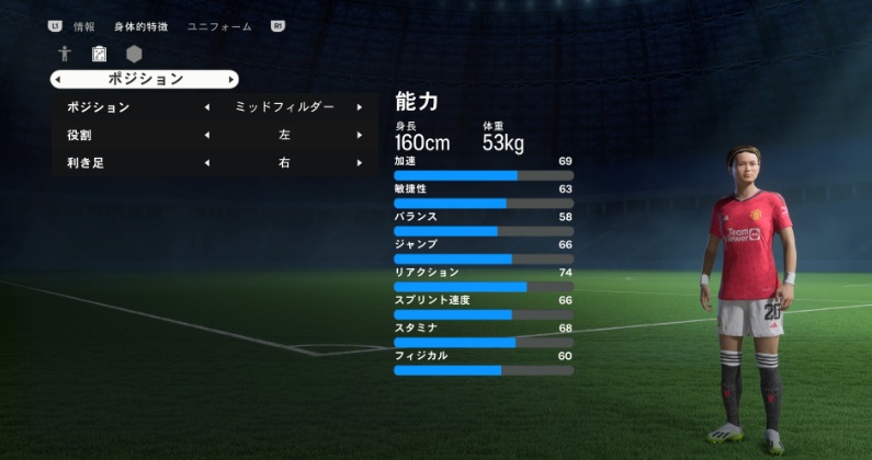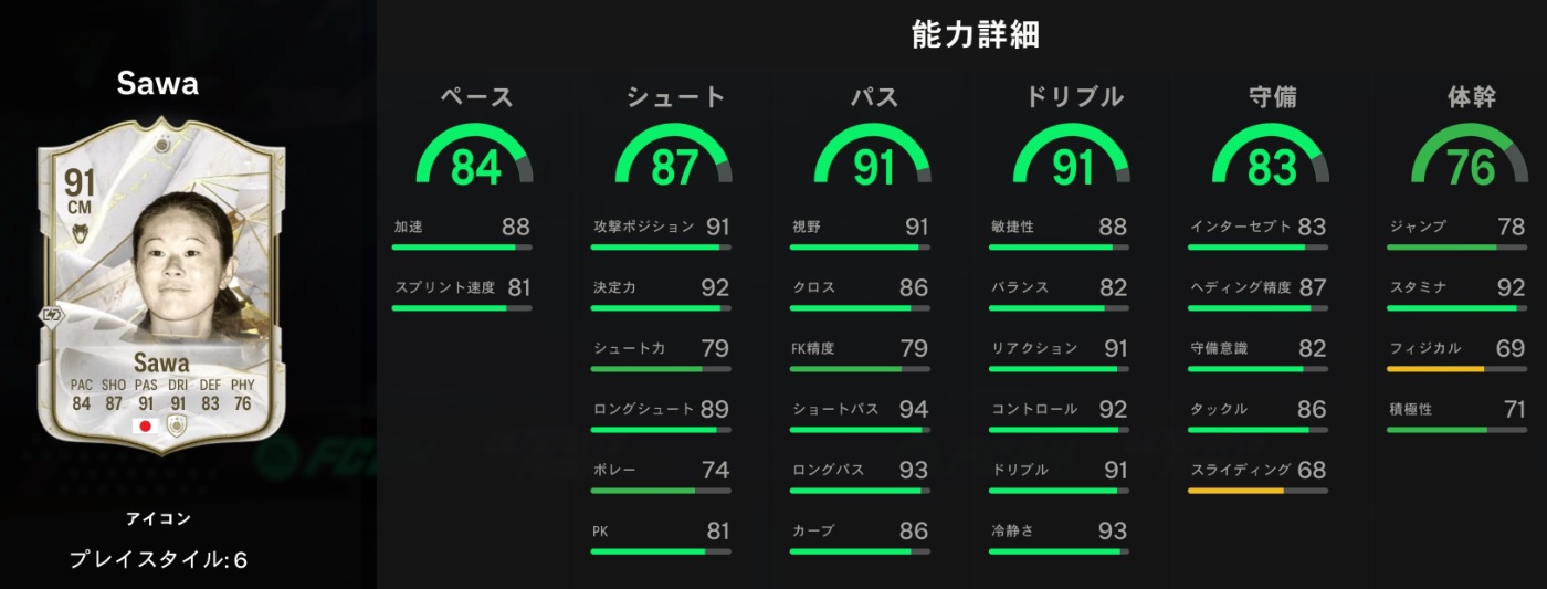宮澤の総合値は75になっているが、加速やスプリント速度、敏捷性はもっと高くいいはず。