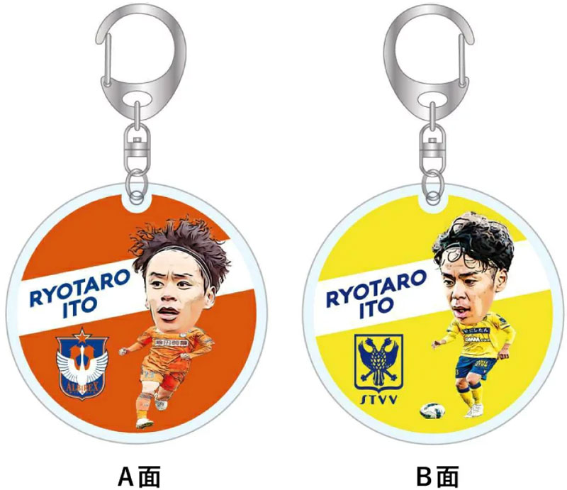 STVVと新潟、2人の伊藤選手がクルクル回るキーホルダー。どちらかをラッキーカラーに決めて回して占い遊びもできるぞ!