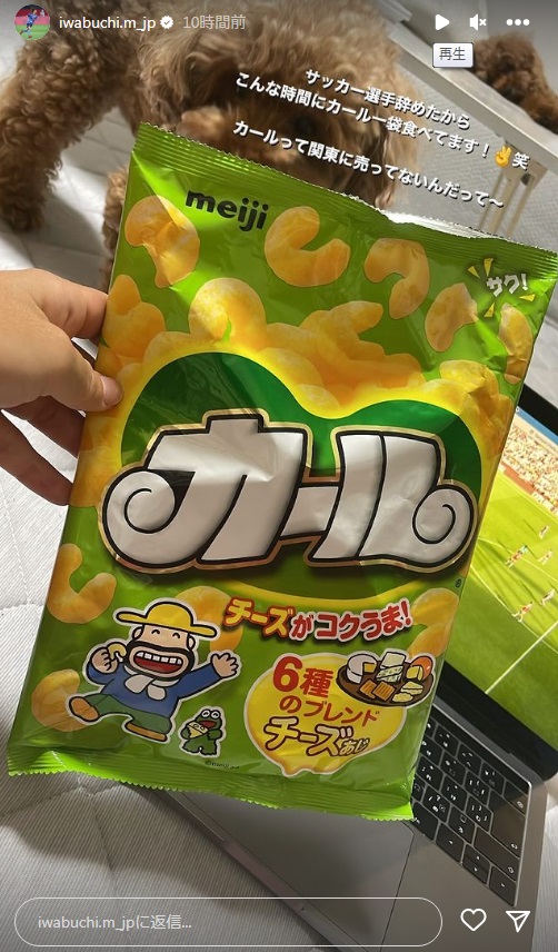 「サッカー選手辞めたからこんな時間にカール一袋食べてます!笑 カールって関東に売ってないんだって~」。