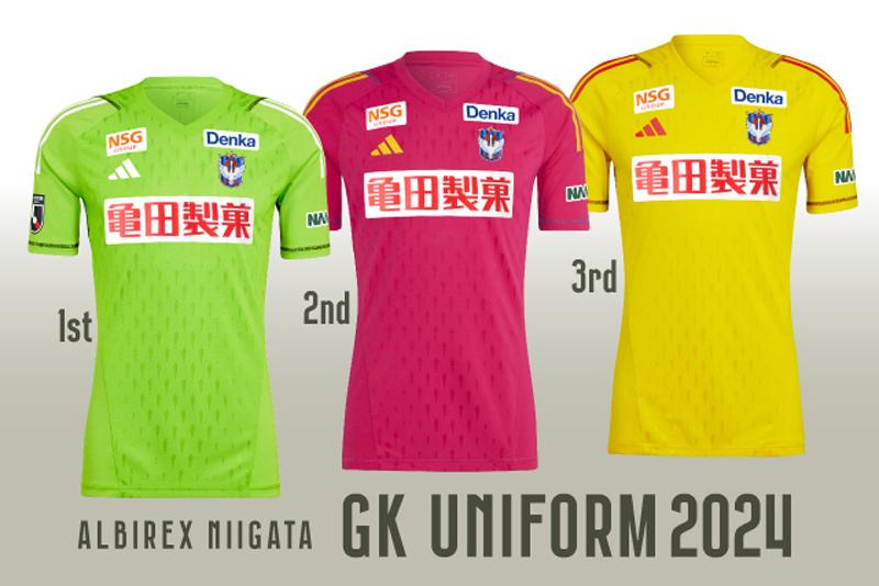 2024ゴールキーパーユニフォームはグリーン、ピンク、イエローの3色展開。ベースのシャツは2023モデルから継続使用のようだ。