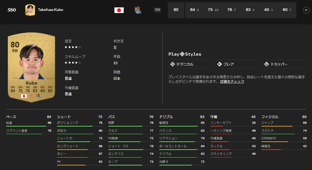 スピード84、シュート75、パス76、ドリブル83、守備40、フィジカル60