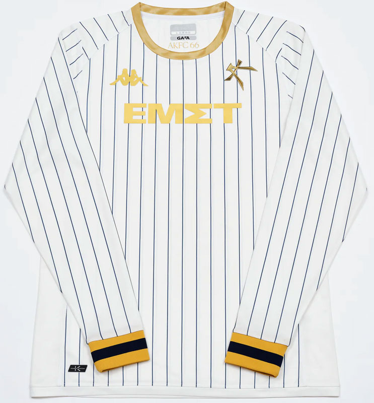 胸にはスポンサー「アテネ国立現代美術館」のワードマーク(文字のみの企業ロゴマーク)である“ΕΜΣΤ”を掲出。このロゴデザインもユニフォームを印象深いものとしている。