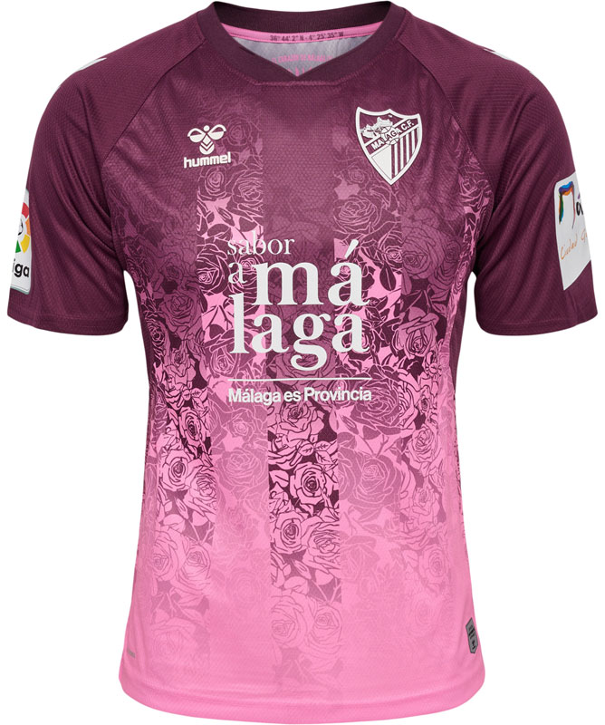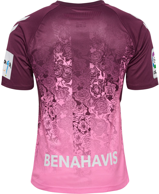 このアウェイユニフォームはローズカラーをベースに、マラガのユニフォームとは思えないバラの花を描いた美しいグラフィックが強く印象に残る。