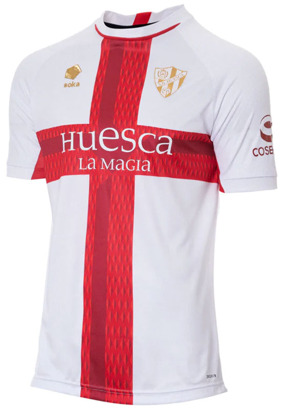 23-24新アウェイユニフォームは、ホワイトを基調にレッドの十字を大胆にあしらう伝統のデザイン。ウエスカのアウェイといえば十字のイメージが強い。