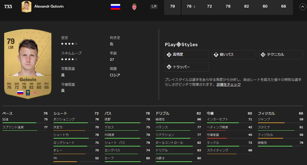 南野の総合値が74なのに対して、ゴロヴィンは79。