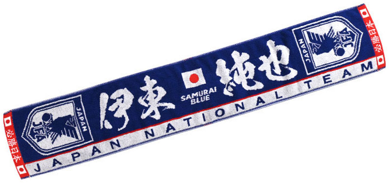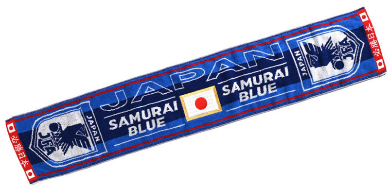 定番応援グッズのタオルマフラー。デザインは数種類のパターンが登場したが、こちらは日本を強く感じさせる「日の丸」バージョン。濃淡ブルーのストライプもカッコいい。