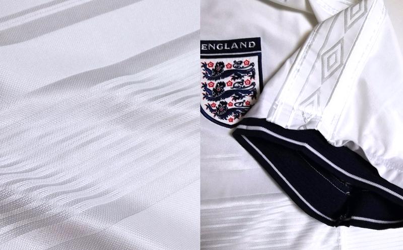 シンプルで美しく、それでいてレトロなサッカーユニフォームをお探しならば、イングランド代表の1999モデルがオススメ。透かしのボーダーを走らせる生地の美麗な光沢感に惚れ惚れするはずだ。