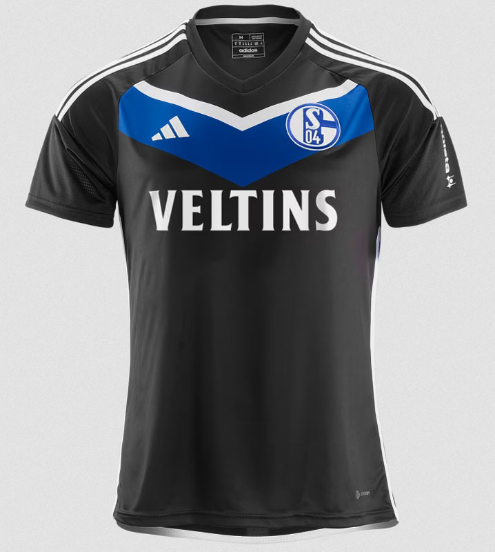 23-24新サードユニフォームはブラックを基調色とし、ブルーとホワイトのV字が力強さを感じさせるデザイン。シャルケでこのようなV字はおそらく初めての採用と思われる。