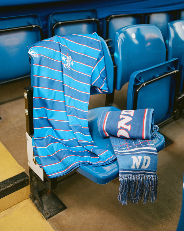 マフラーと一緒に写るのは今回のコレクションのモチーフとなっているユニフォーム。1983-84と84-85の2シーズンで使用したホームユニフォームで、2部時代の83-84シーズンはカノヴィルの活躍もあり1部昇格を決めている。