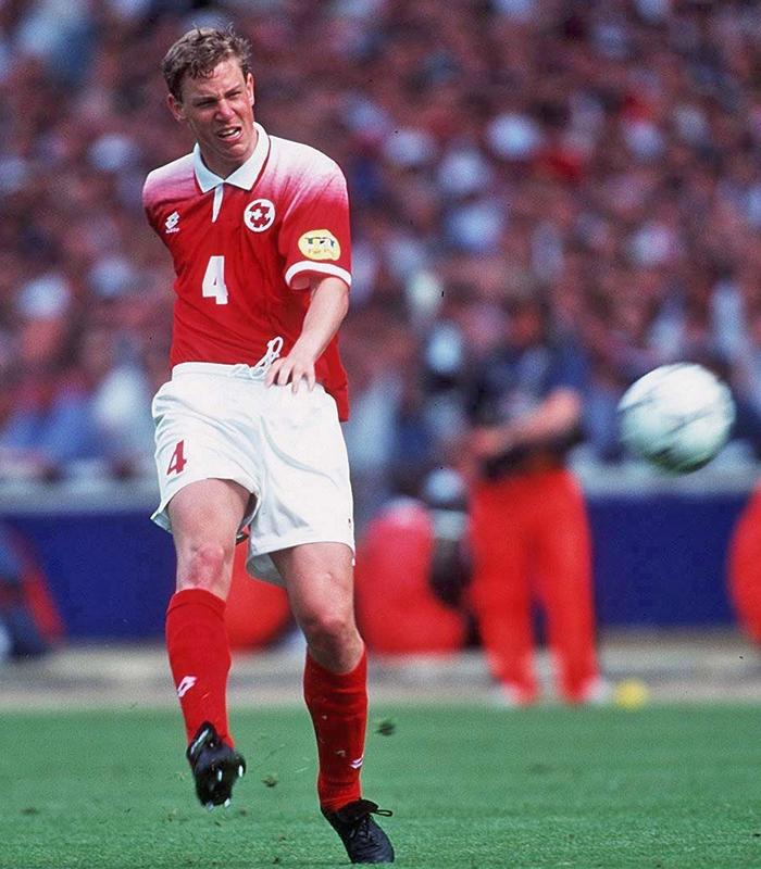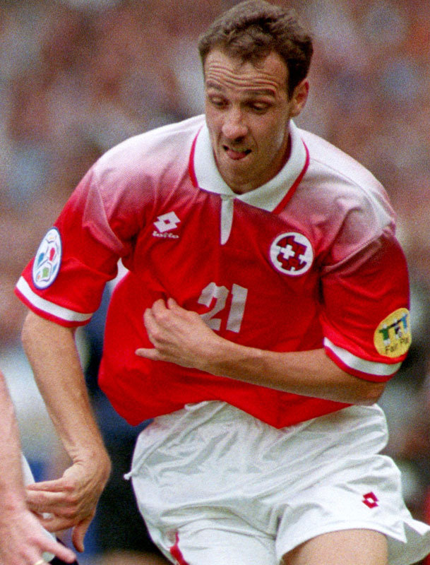 レッドを基調色とするスイスのホームユニフォームは基本的に単色で塗りつぶすようなデザインが多いが、この96モデルはホワイトを使用した肩部分のグラデーションが美しい。この次(1997モデル)からスイスはPumaと契約する。