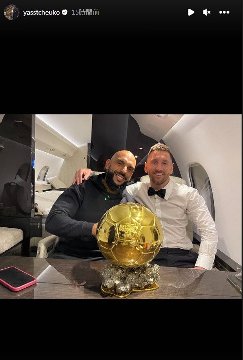 メッシとバロンドールトロフィーとの3ショット!これはプライベートジェットの機内だろうか。