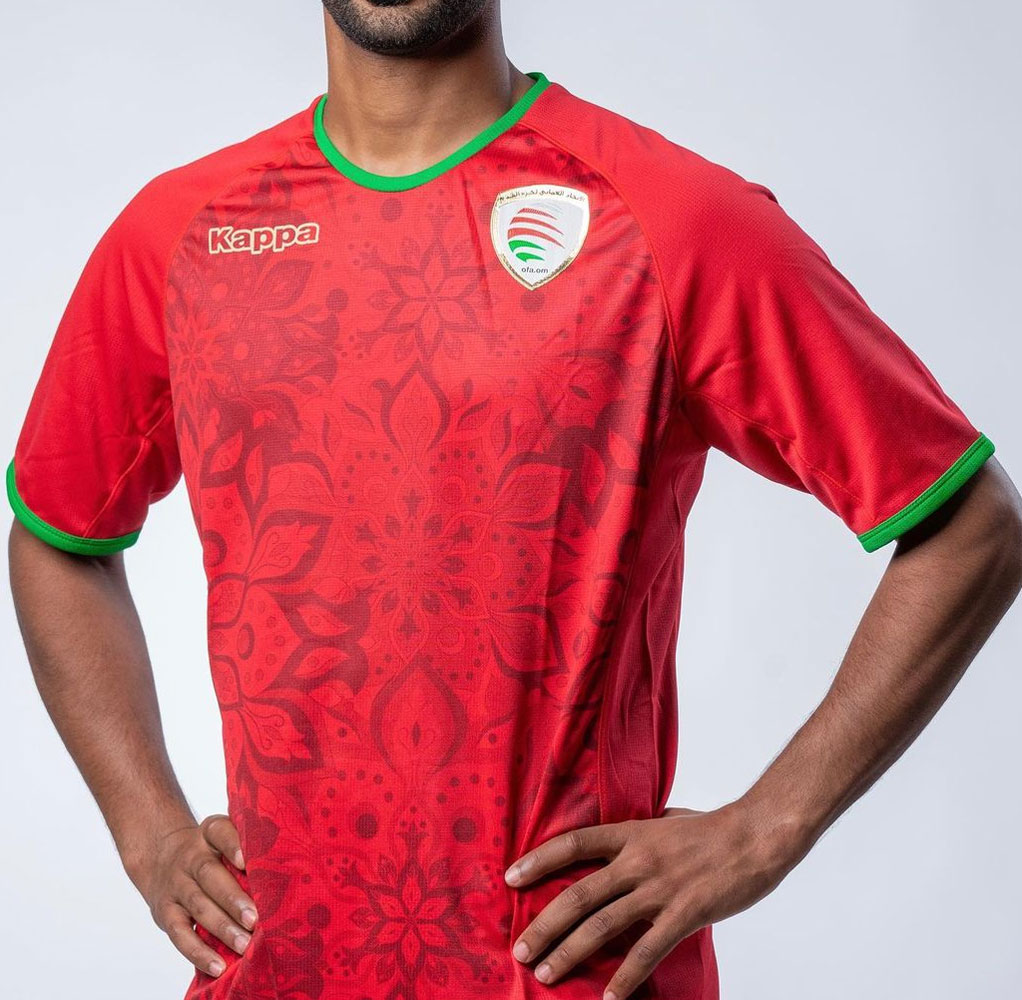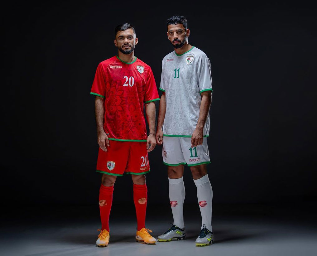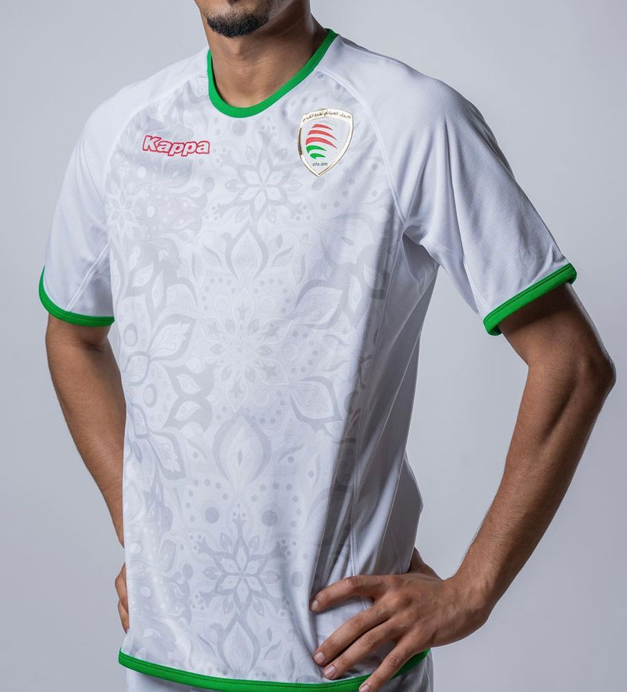ホーム・アウェイともにグリーンを差し色に使用。「赤・白・緑」はオマーン国旗の3色で、ユニフォームの色はどちらも国旗色をベースとしている。