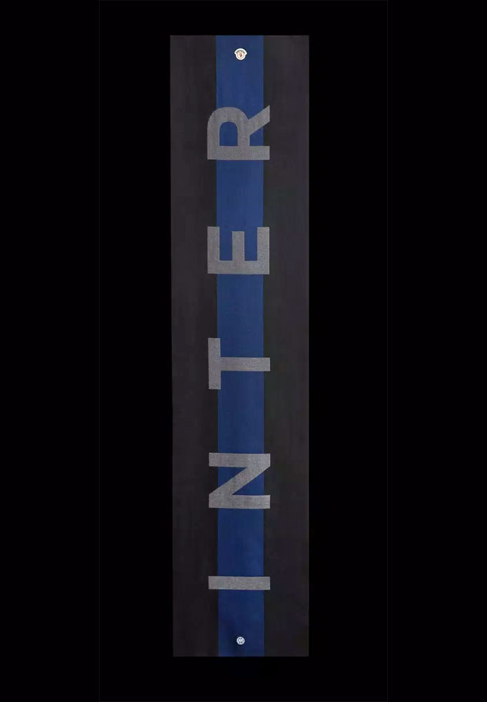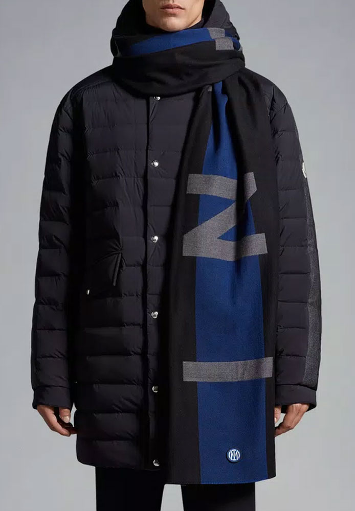 ウール混紡素材で作られたスカーフ。両端にMonclerとインテル両者のロゴマークを配する。
