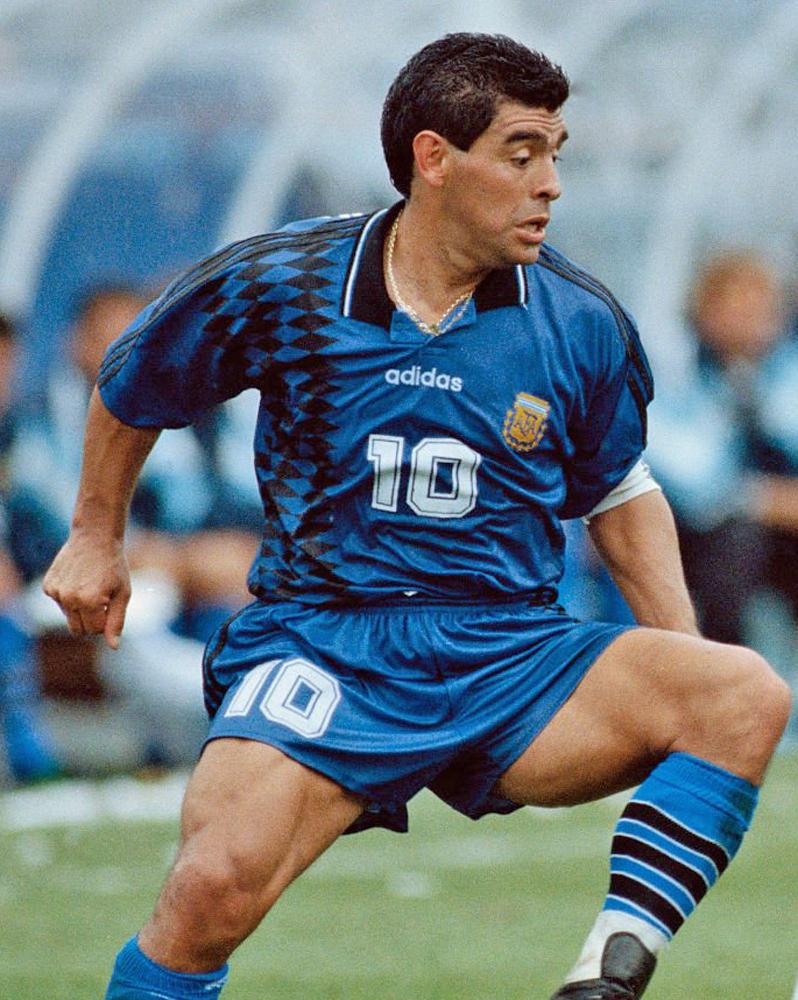 青いユニフォームを着たマラドーナ氏は94W杯グループステージ初戦のギリシャ戦で強烈な一撃をネットに突き刺し、W杯通算8得点目を決めている。しかし同氏はその後、ドーピング問題で大会から追放処分に。結果的にギリシャ戦での一撃が代表キャリアで最後のゴールとなった。