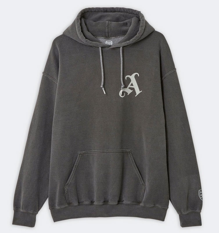 ゴシックフォントの「A」ロゴをデザインしたグレーのパーカー。オーバーサイズのフィット感。素材はコットン50%、ポリエステル50%。