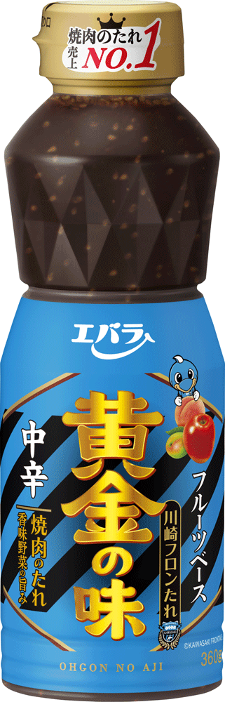 パッケージは特別仕様だが中身は通常の「黄金の味 中辛」。厳選されたリンゴ、モモ、ウメなどを秘伝の黄金比率でブレンドした、果実たっぷりでコクのある焼肉のタレで、1978年の初登場以来、愛され続けているキング・オブ・焼肉のタレである。