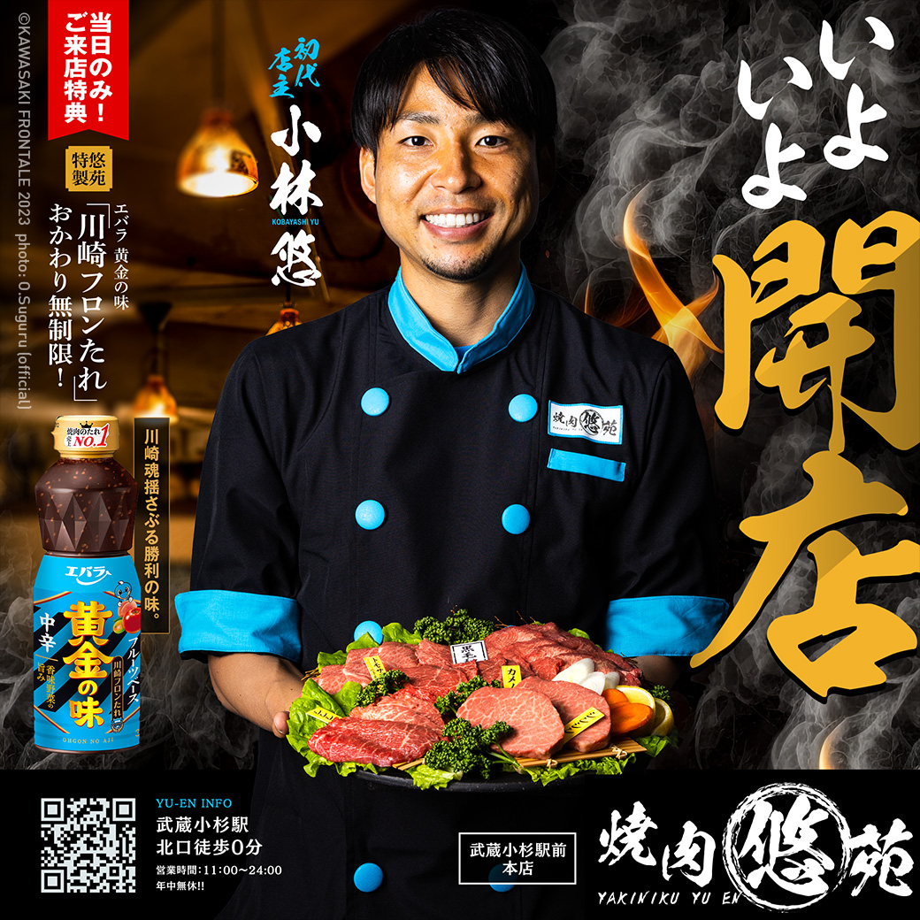 「小林悠選手 焼肉屋開店のお知らせ 川崎フロンターレ 小林悠選手が店主を務める『焼肉悠苑』が川崎市内にオープンします。こだわりの“たれ”は、エバラ 黄金の味『川崎フロンたれ』を使用。店主も開店準備で大忙しです。」