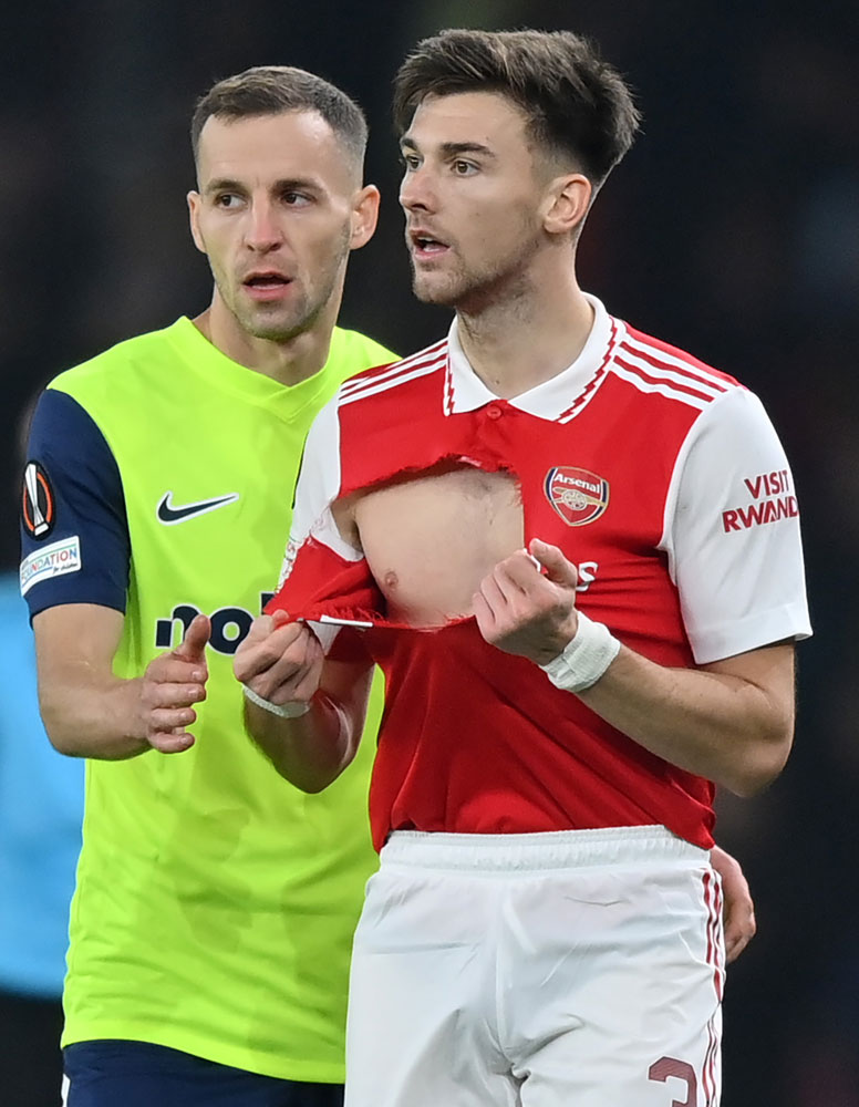 冨安健洋が所属するアーセナルでも最近ユニフォームが引き裂かれた。2022年11月のEL・チューリッヒ戦でキーラン・ティアニーの胸部がえぐり取られるように破かれている。