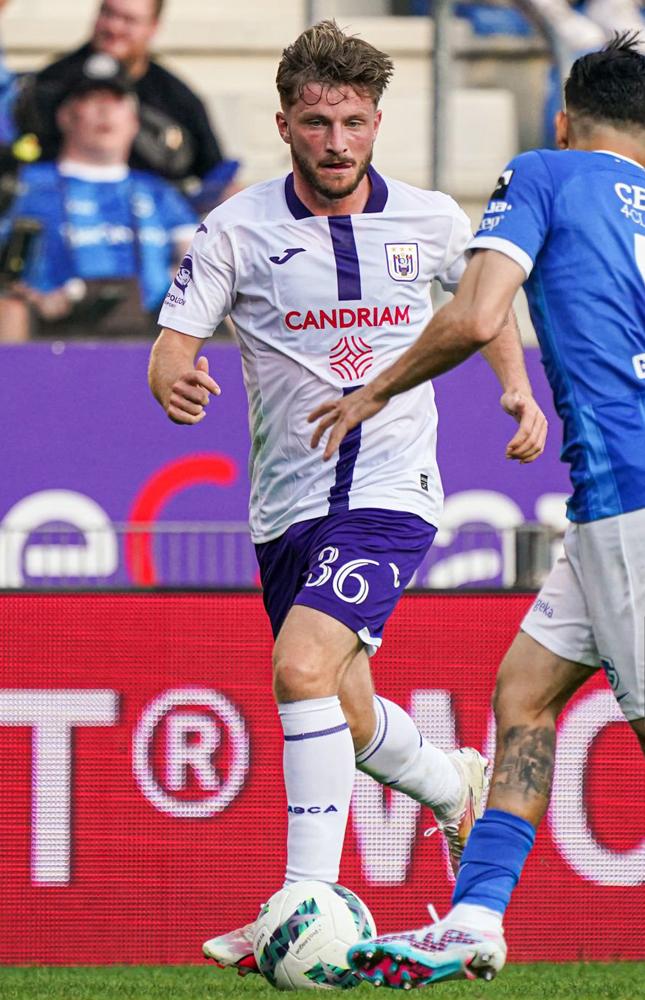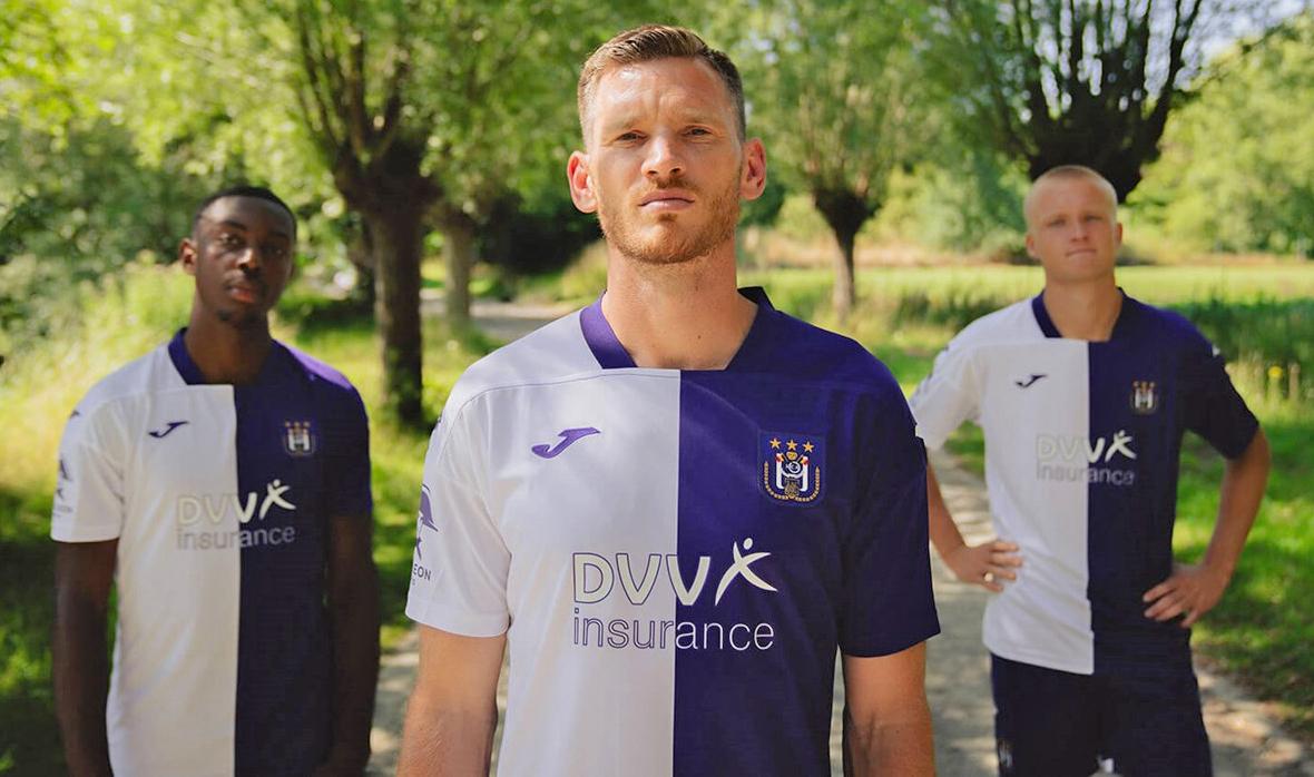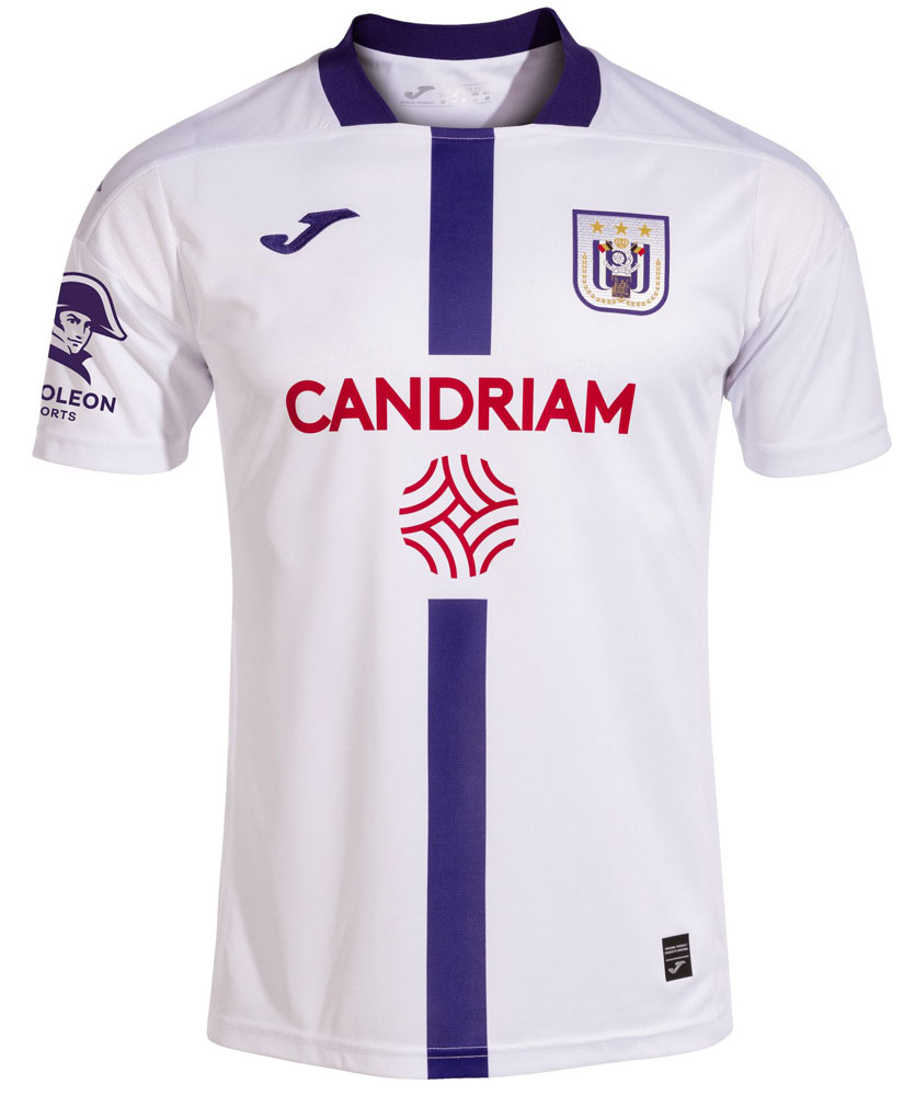 23-24アウェイユニフォームはホワイトを基調に、中心にパープルのストライプを走らせるデザイン。アンデルレヒトのアウェイでは伝統的な色の組み合わせとなる。
