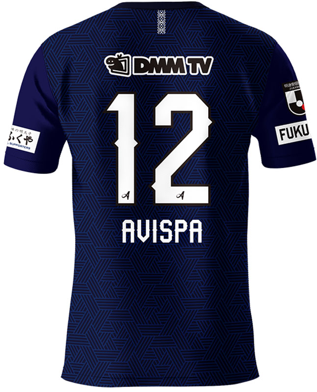 背面首元のワンポイントデザインにはホームタウン「FUKUOKA」を表すシンボルマークとして、 博多織の代表的な博多献上模様と、差し色には先人へのリスペクトとして、アビスパ福岡の前身である藤枝ブルックスの藤色を継続する。